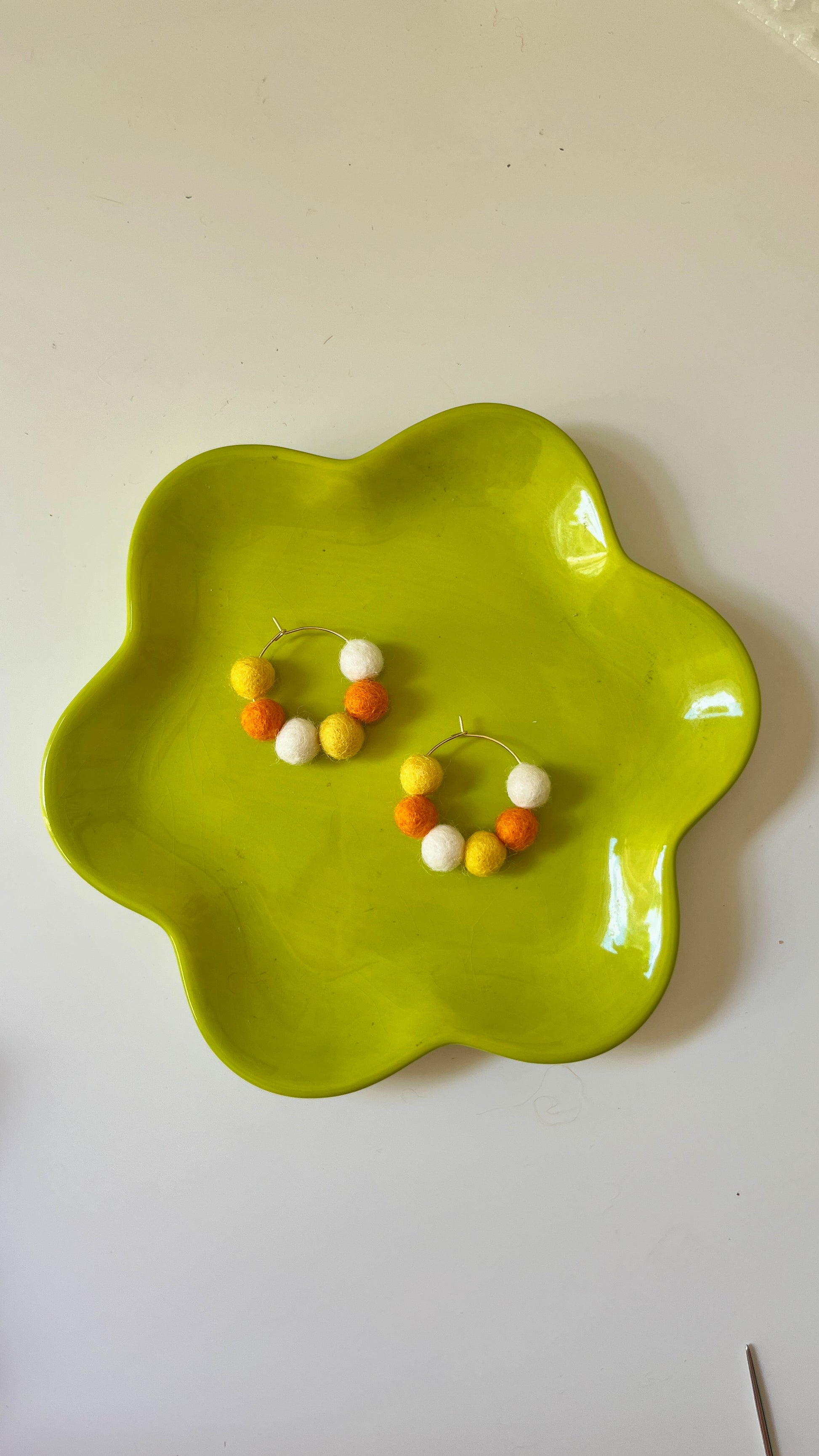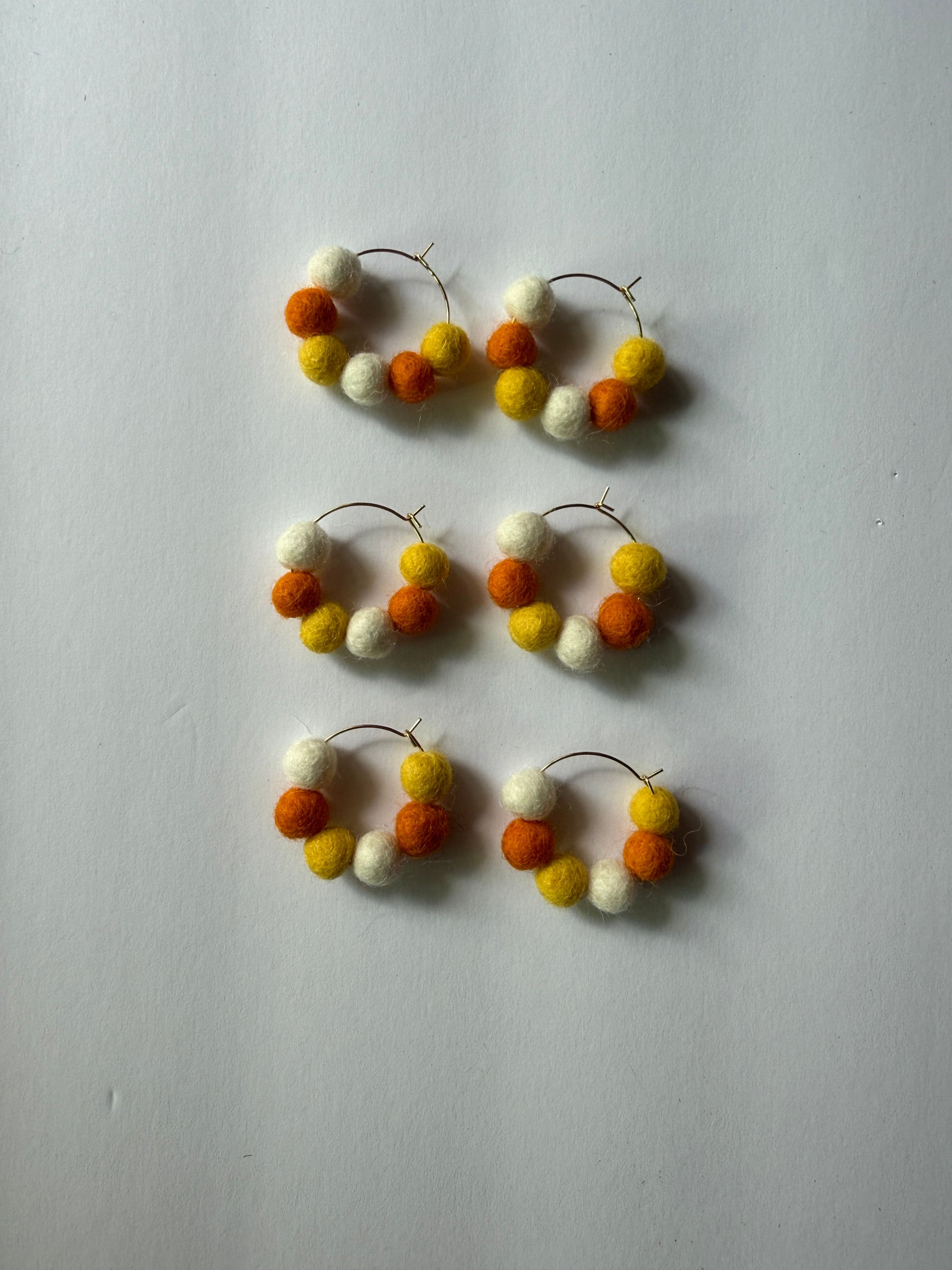 These Candy Corn Felt Ball Hoop Earrings are the perfect sweet treat for your ears! Featuring adorable candy corn colored felted balls, these earrings are sure to make a playful and quirky fashion statement. Treat yourself to these one-of-a-kind earrings today!