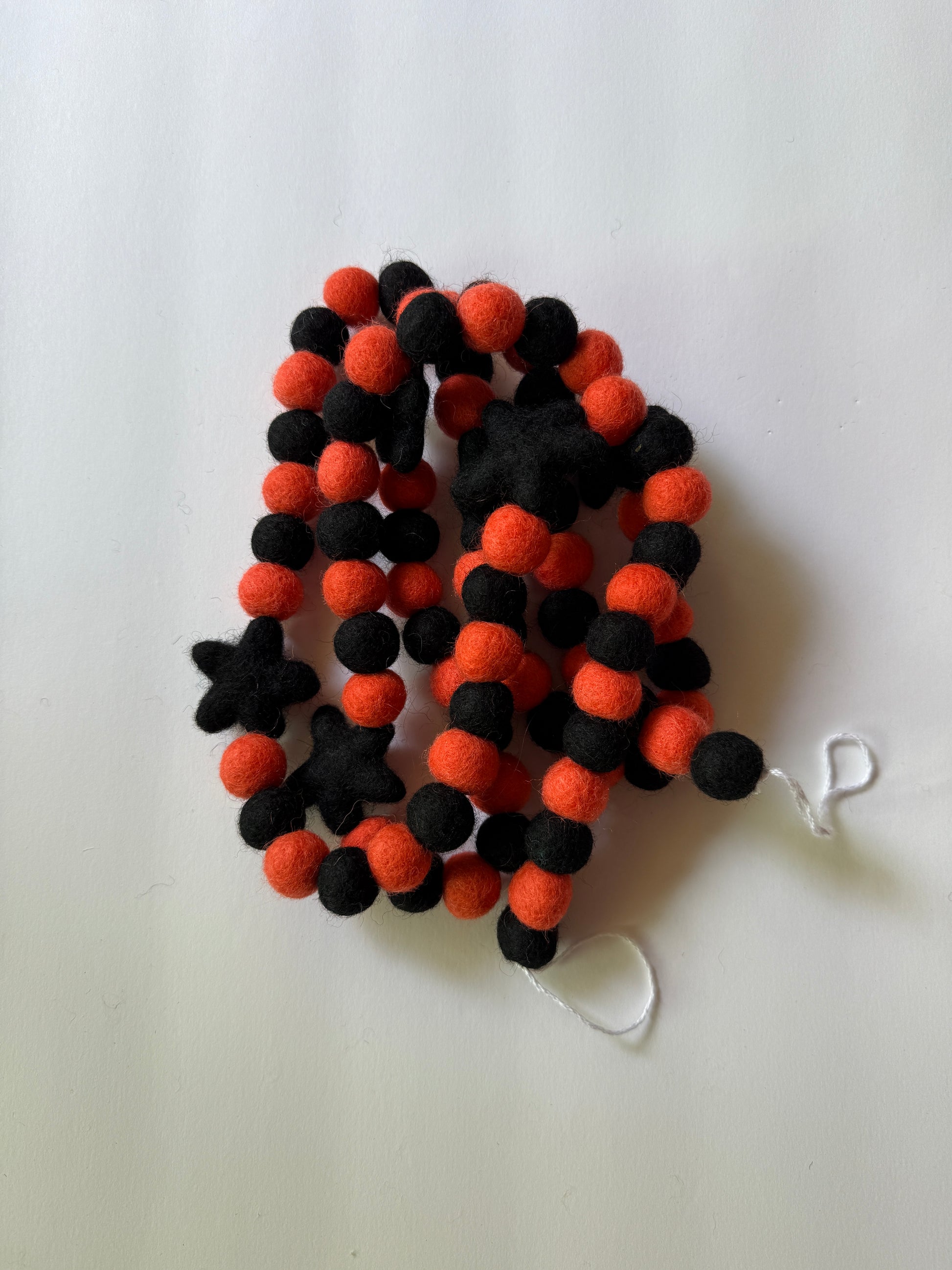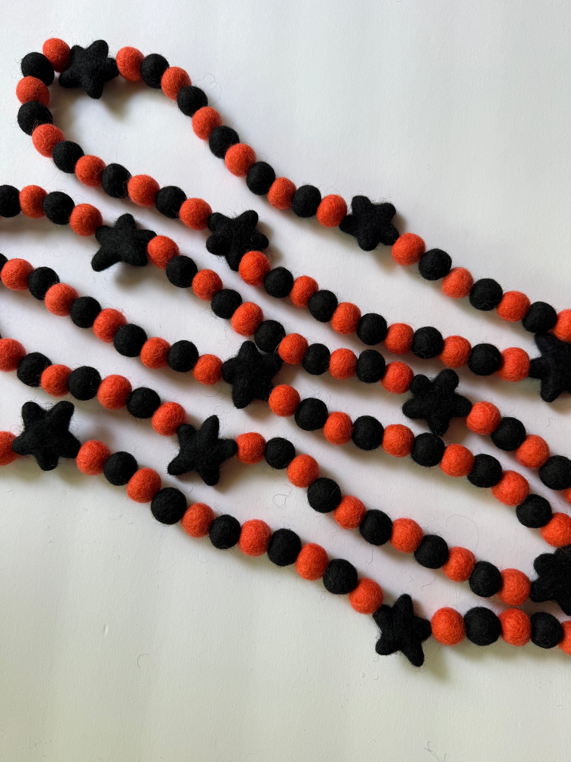 Celebrate spooky season with this playful 5.5 ft garland featuring classic black and orange leaves. Accented with charming black felted stars, it adds a festive touch to any space, perfect for Halloween decorating fun.