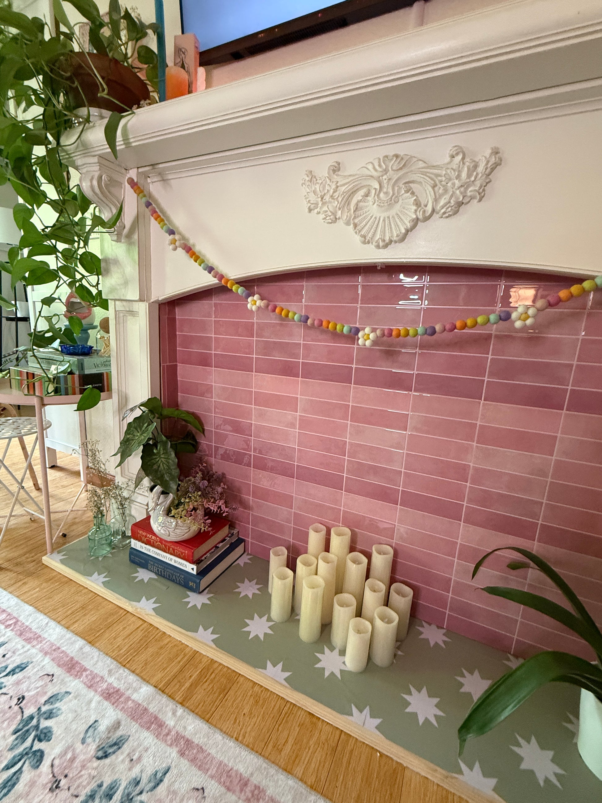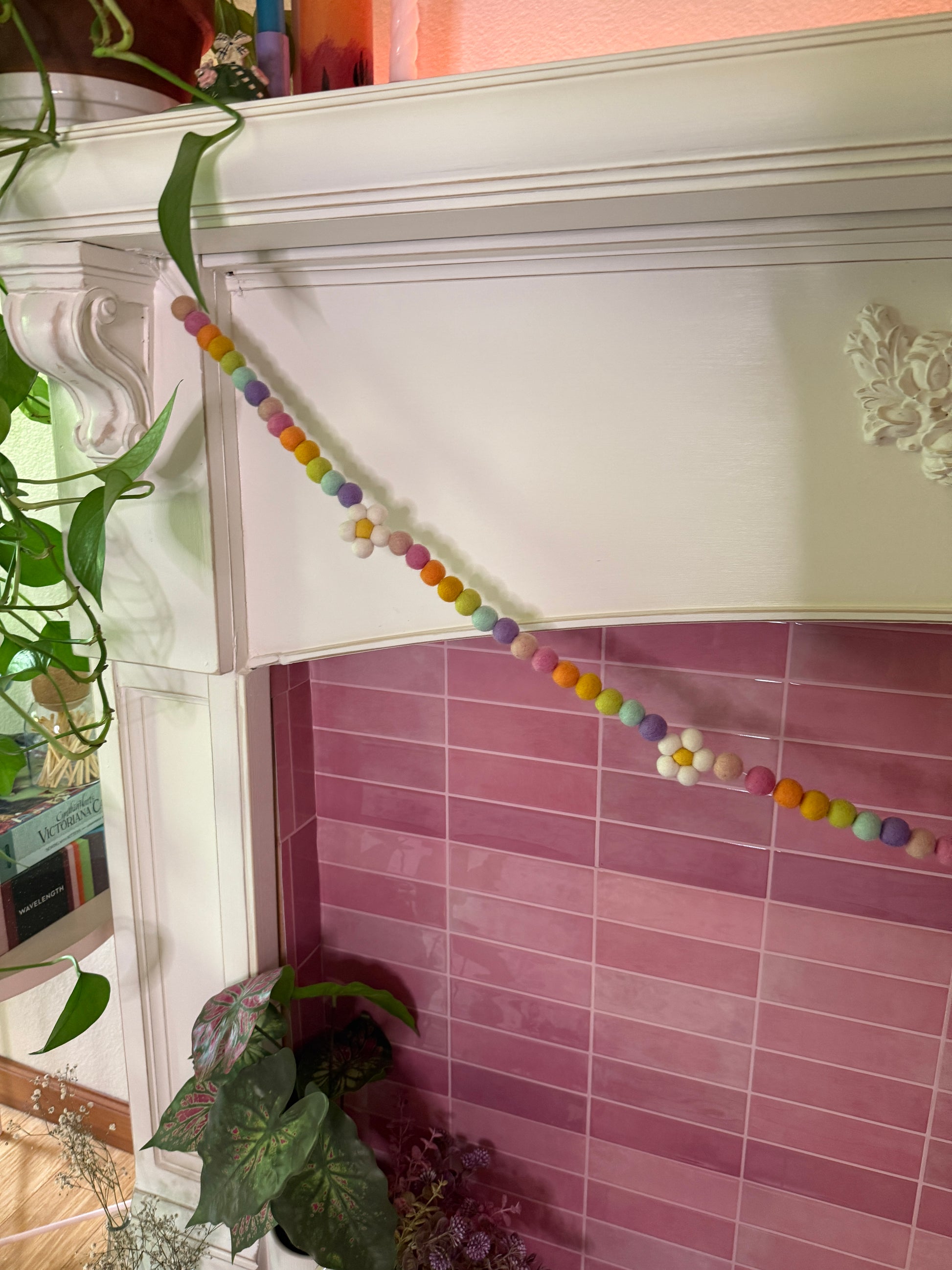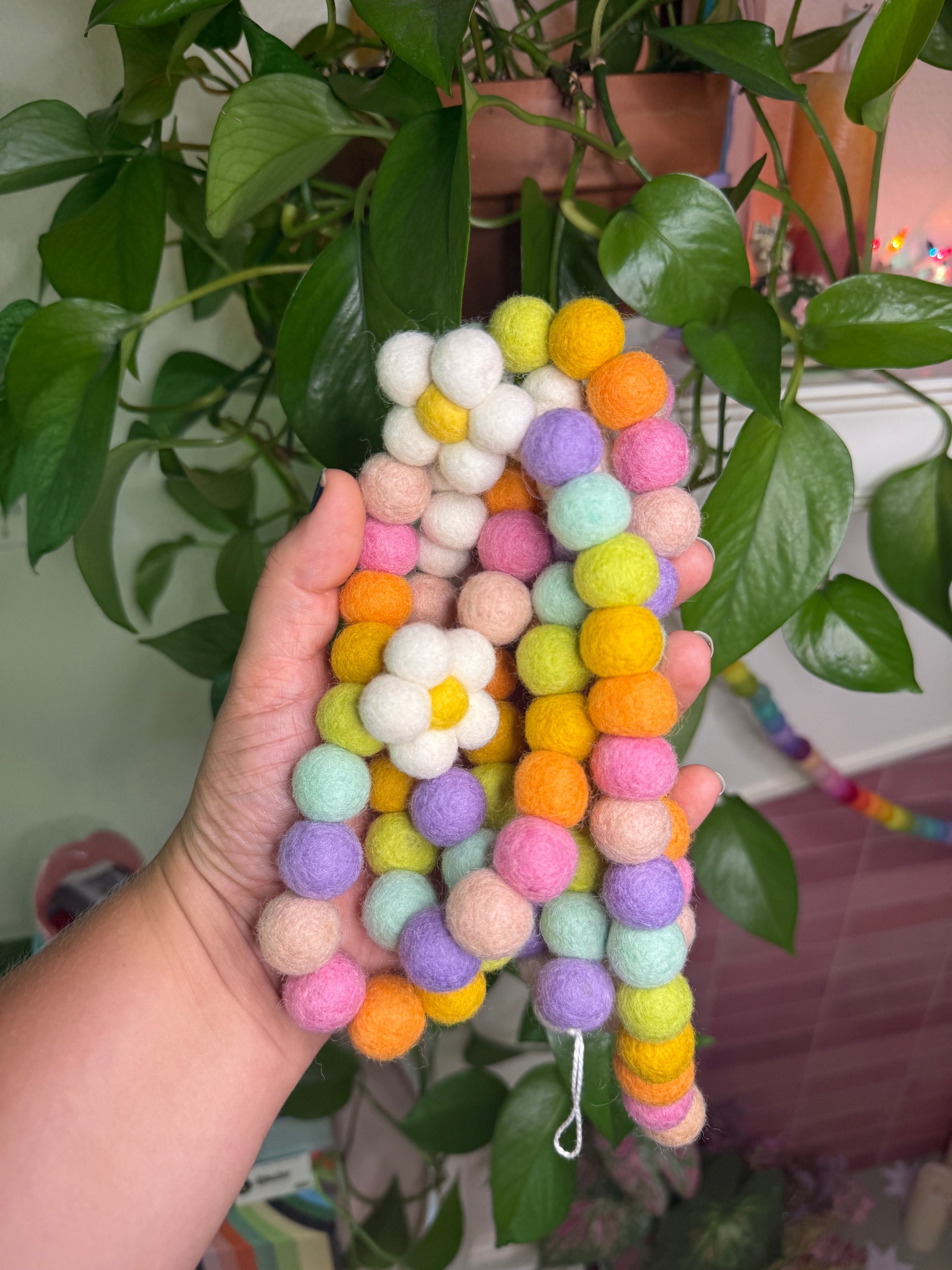 Bring a pop of pastel charm to any room with this playful Pastel Daisy Garland. Stretching about 5.5 feet long, it combines soft felted balls in gentle rainbow hues with five cute white daisy shapes. Perfect for brightening up celebrations or adding a whimsical touch to everyday decor!