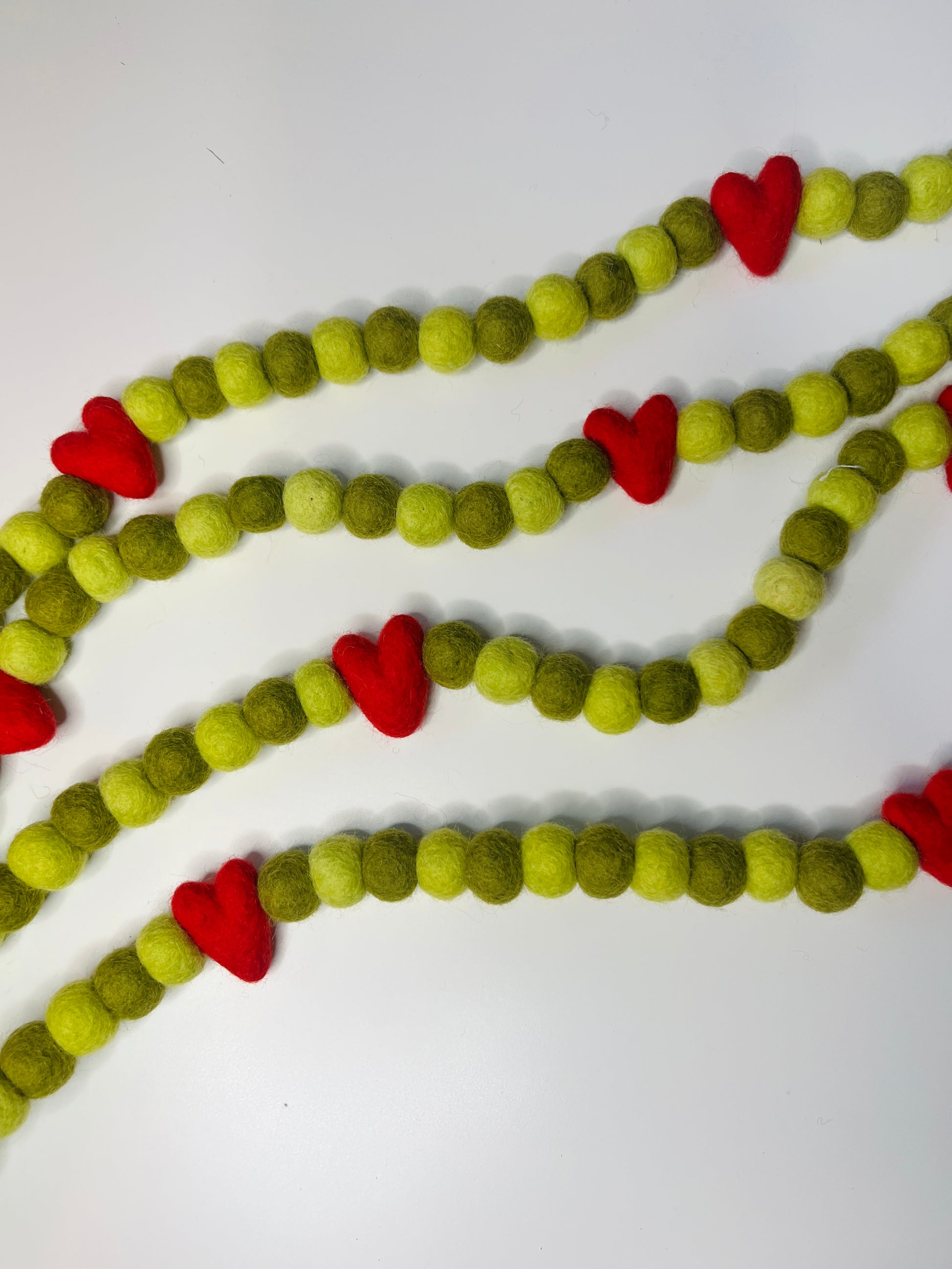 Even the Grinch's heart would grow three sizes with this whimsical 5.5-foot felt garland! Featuring adorable red and green hearts in two complementary shades, this playful piece captures the magic of holiday redemption and warmth. Perfect for fans of the beloved classic, it adds a touch of mischievous charm to mantels, doorways, and banisters. The soft felt hearts are durable enough to become a cherished decoration season after season. Spread some Grinch-approved cheer and remind everyone that the best gifts come from the heart!